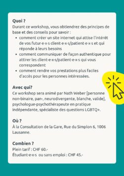 Cet atelier de 2h vous permettra de réfléchir à la façon dont vous communiquez avec vos futur·e·x·s client·e·x·s/patient·e·x·s via votre site internet et/ou votre profil sur des annuaires professionnels. En effet, personne ne nous apprend à gérer cet aspect de notre profession, qui est pourtant essentiel pour s’assurer de remplir notre agenda et d’avoir des suivis satisfaisants.